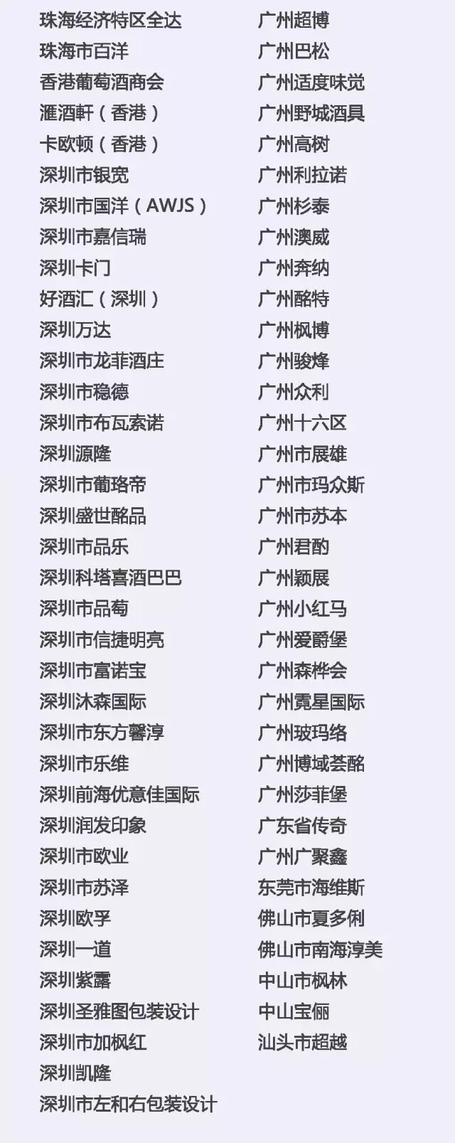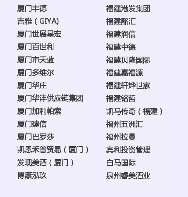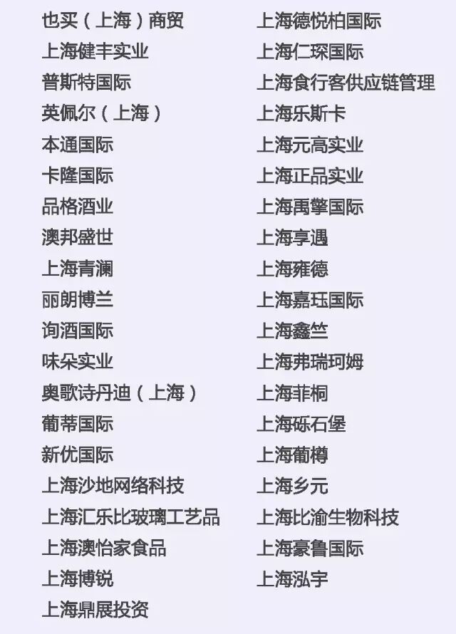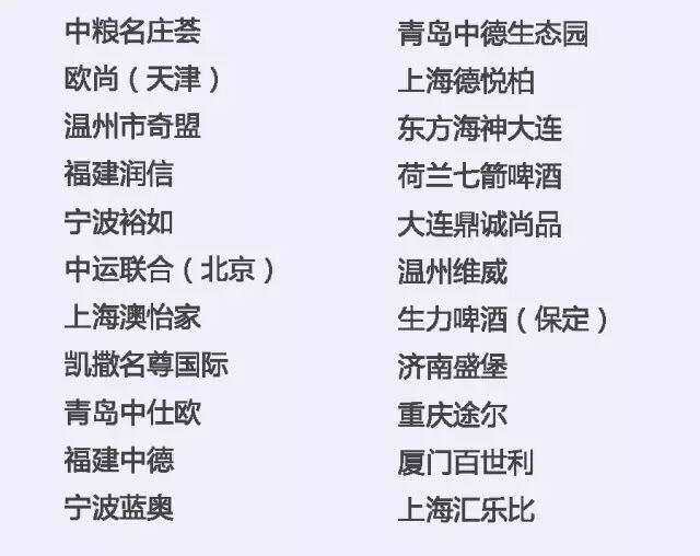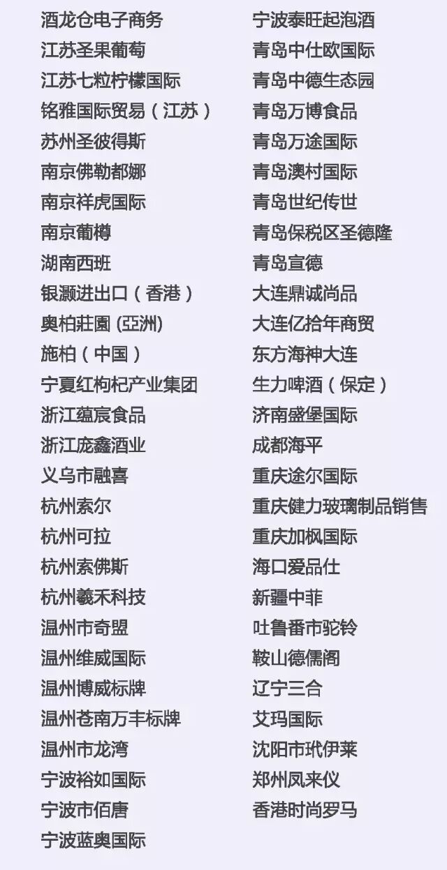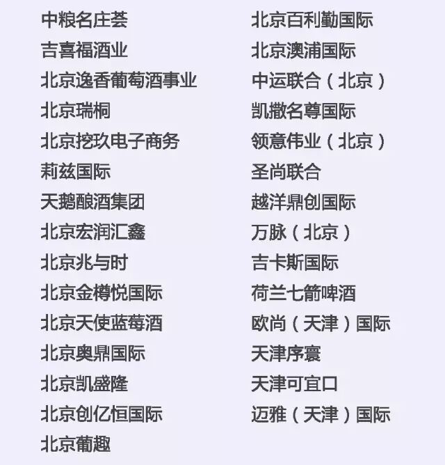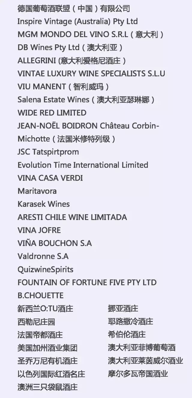 中粮名庄荟、天鹅酿酒集团、也买酒、北京挖玖电子商务、北京逸香、吉喜福酒业、香港葡萄酒商会、香港滙酒軒、上海普斯特(上海巨信)、上海健丰、福建酩汇、厦门丰德,厦门世展星宏、厦门华沣、厦门发现美酒、深圳市国洋(AWJS)、深圳好酒汇、深圳卡门、深圳万达、广州众利、广州十六区、广州高树、珠海全达实业、浙江蕴宸、杭州可拉商贸、温州奇盟、新疆沙地,济南盛堡、青岛中德、青岛中仕欧等国内知名进口商及品牌运营商将带来全球21个国家的精品酒庄品牌。(更多优质进口商名单请见文末详细清单)