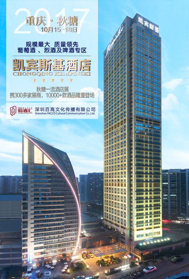 今年秋糖萄酒汇精品酒店展将于10月15日-18日在重庆凯宾斯基酒店举办。据悉,重庆凯宾斯基酒店展将是本届秋糖规模最大及最具影响力的葡萄酒专区酒店展。