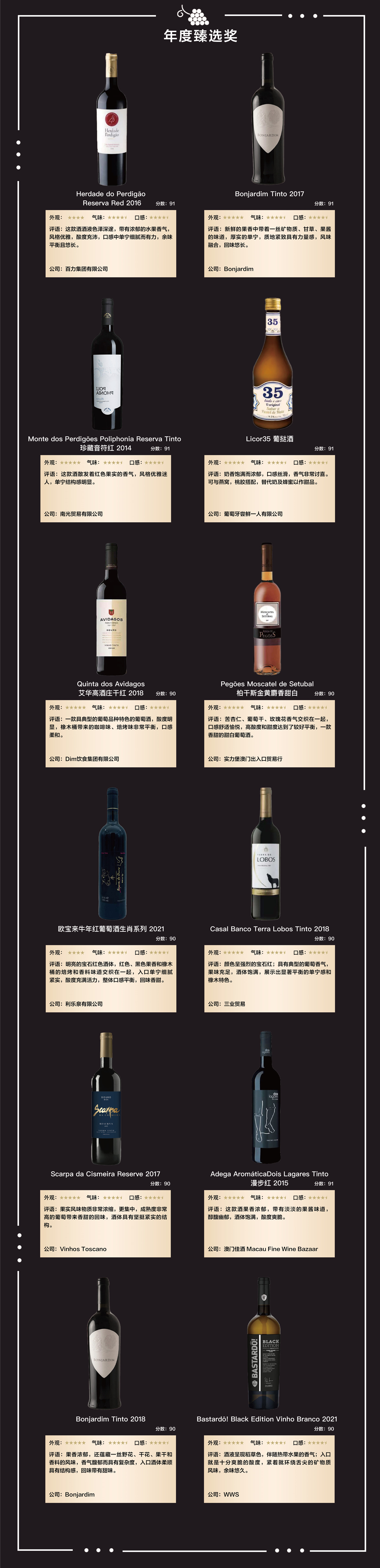 来自粤港澳大湾区的酒业、餐饮、教育、媒体、商超等行业的专业评委,甄选出34款优质葡语国家酒款,其中有6款获得“年度卓越奖”, 12款获得“年度臻选奖”以及16款获得“年度潜力奖”。